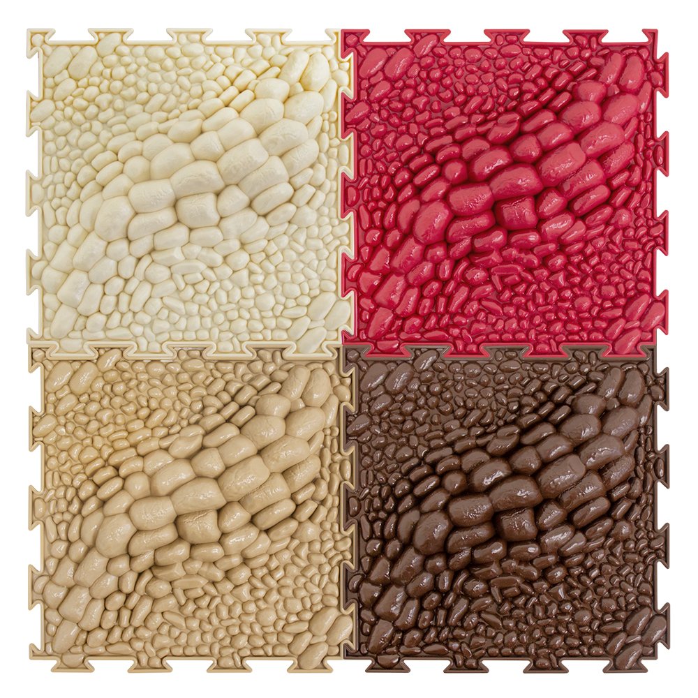 Die Matten haben eine 3D-Oberfläche mit großen und kleinen Kieselsteinen, die einen ausgedehnten, schmalen Hügel mit abgerundeten Spitzen und steilen Hängen bilden. Die Übungen auf der Matte vermitteln das Gefühl, auf den Gipfel des Berges zu klettern, und tragen so zur Entwicklung von Koordination und Gleichgewicht bei. Das Set ist in stilvollen, warmen Farben gehalten.